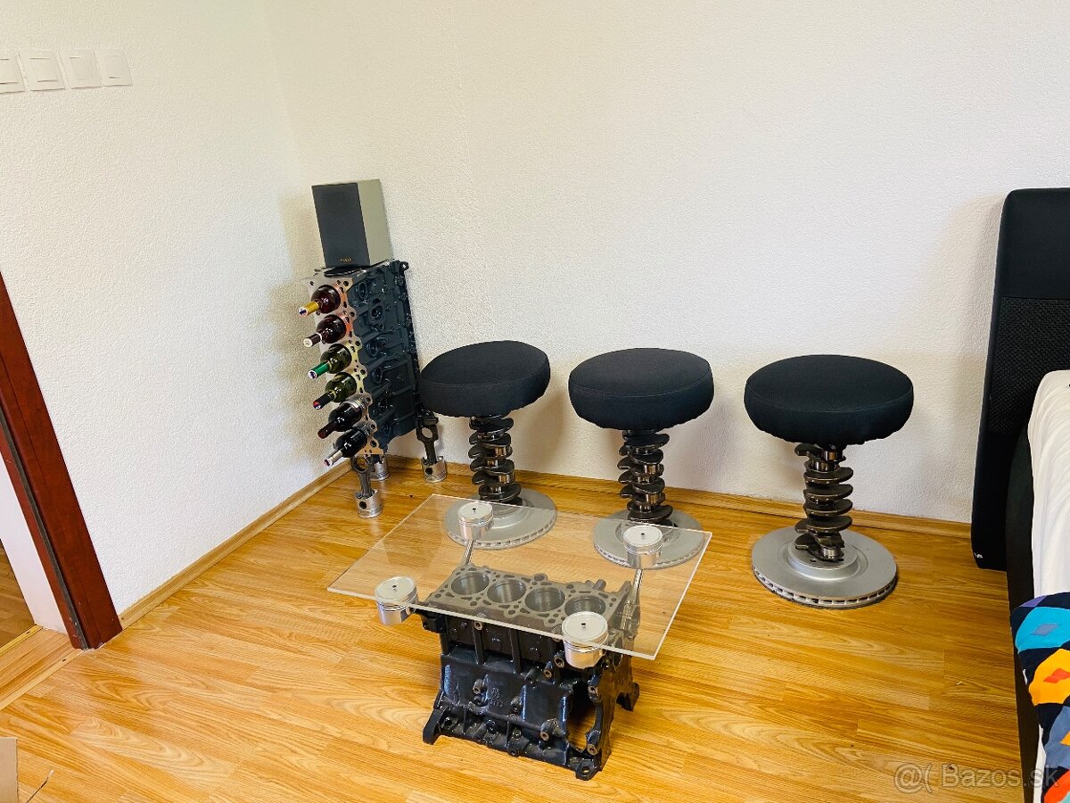Pomukam na predaj tento stolik v bolku motora Audi S3 1.8 turbo vhodný ako konferenčný stolik alebo nočný stolik ku posteli na vrchu nerozbitné plexisklo, motor bol po poškodení ojnice čo dodáva stolíku príbeh a jedinečnosť. V prípade záujmu Pomukam na predaj aj lampu z turba alebo stojan na víno z BMW