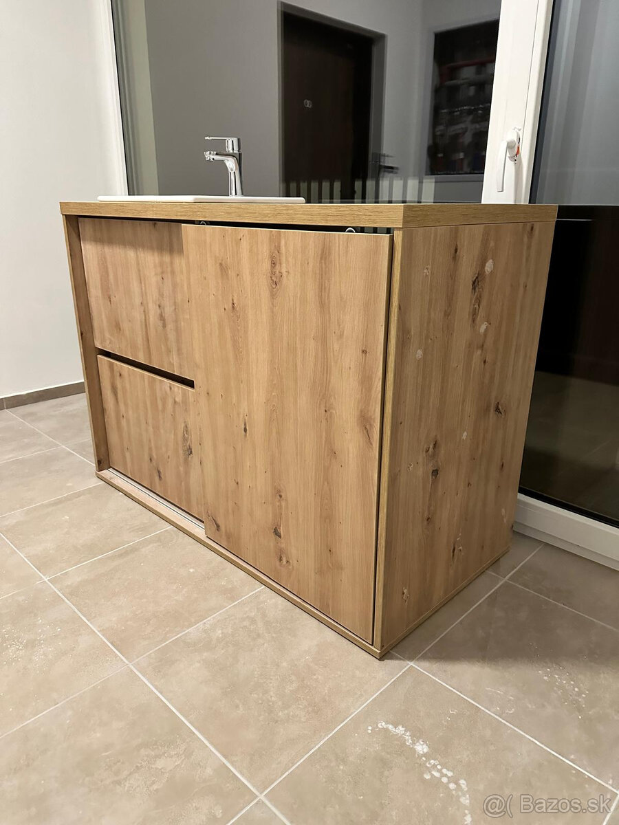 Skrinka do kúpeľne na práčku s 2 suplikmi a vstavaným umývadlom a osadenou batériou, nové nepožite. Pôvodná cena 300€ - dohoda mozna.