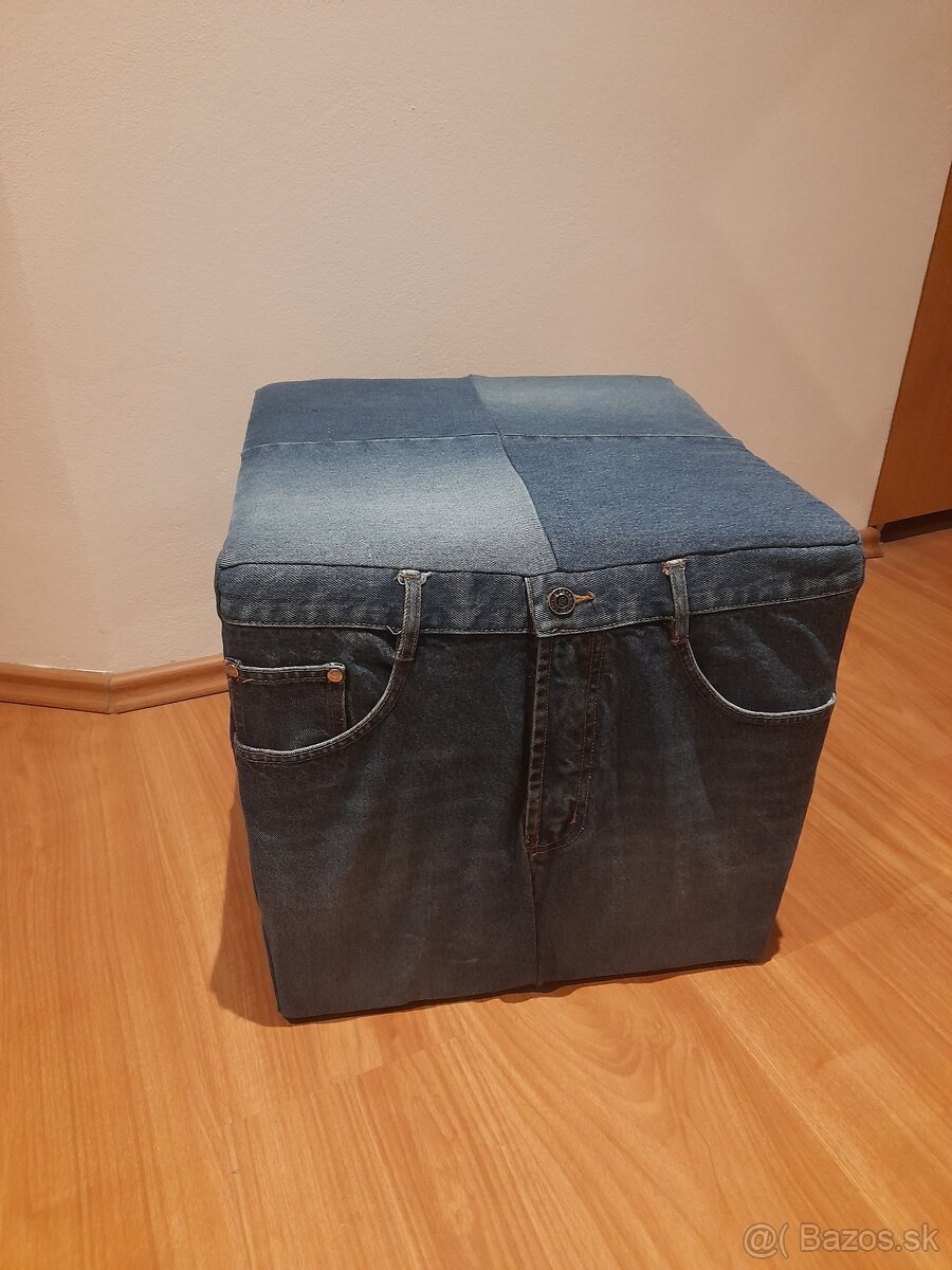 Predám jeansovu taburetku s funkčnými vreckami na odkladanie ovládačov, mobilu a iného.