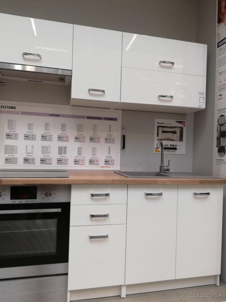 Nová zabalená linka biela vysoký lesk šírka hore 180 cm dole 2 skrinky 120 cm, spolu 5 skrinky za 200 eur, cena s pracovnou doskou 120 cm je 230 eur.