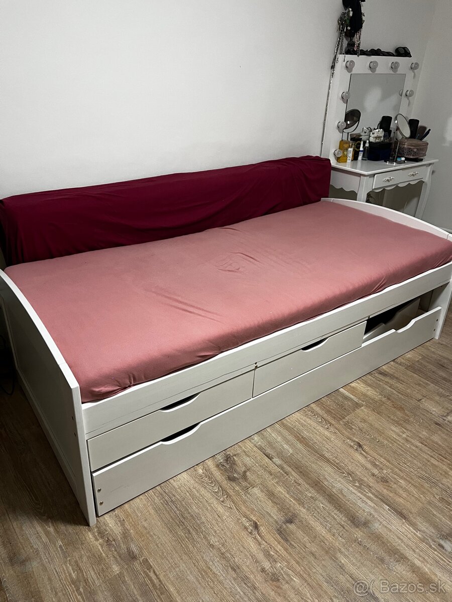 Predám postel aj s matracom, rozmer 90x200cm, postel má pokazenú koľajničku na šuflíku a je prasknutá. Prasknutie sme opravili. Postel drží, vpohode sa na nej vyspí dospelý človek. Rošty sú neporušené. V posteli sa nachádza veľa úložného priestoru, 3 menšie šuflíky a jeden veľký.