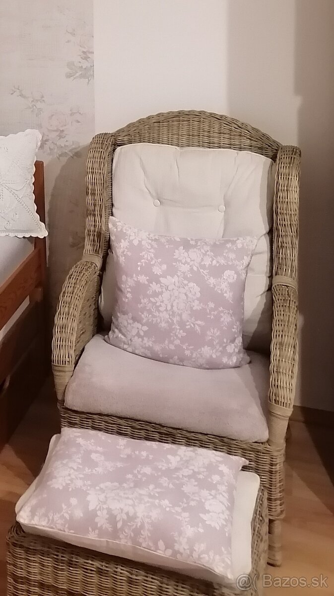 Predám pevné a pohodlné ratanové kreslo s taburetkou.Kreslo je ako nové.Polstrovanie je súčasťou balenia. Šírka kresla je 62cm a výška 101cm.Rozmery taburetky sú šírka 51cm a výška 31cm.Pôvodná cena bola 190€.