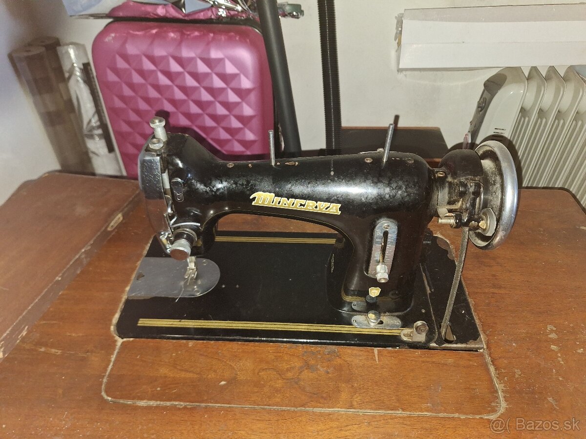 Predám starý mechanický šijací stroj MINERVA 122, kompletný so stolíkom a nožným pedálom.