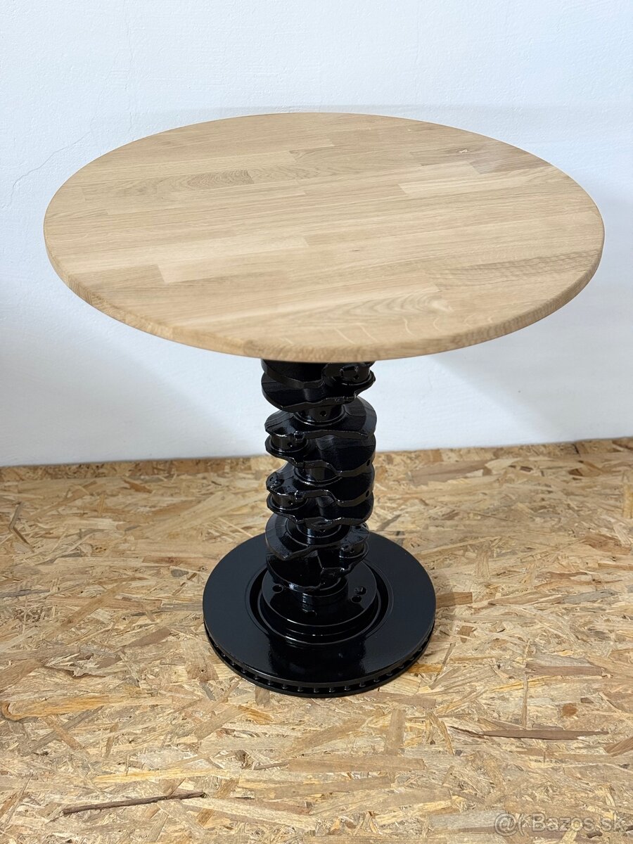Predám dizajnový stolík vyrobený z originálnych autodielov – podstava je z brzdového kotúča a kľukového hriadeľa, vrchná doska je z masívneho dreva.