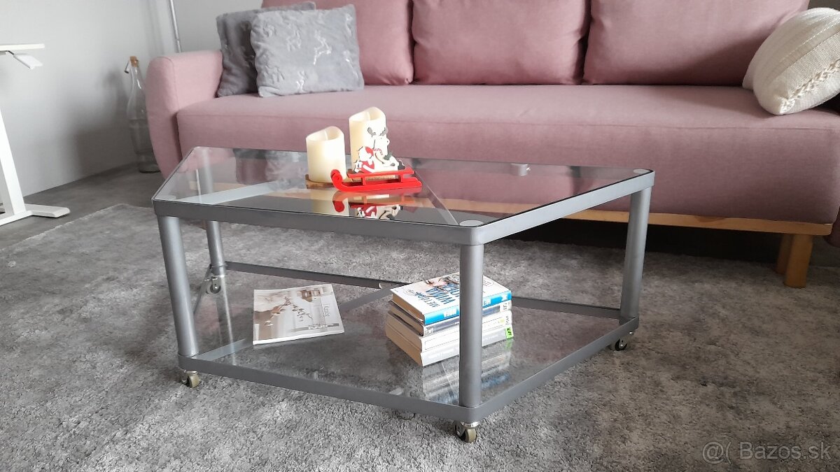 Predám zachovalý konferenčný sklenený stolík, kovová konštrukcia na 4kolieskach. Plne funkčný značky Ikea.Použivaný len príležitostne z nefajčiarskej domácnosti bez zvierat.Rozmery viď foto.