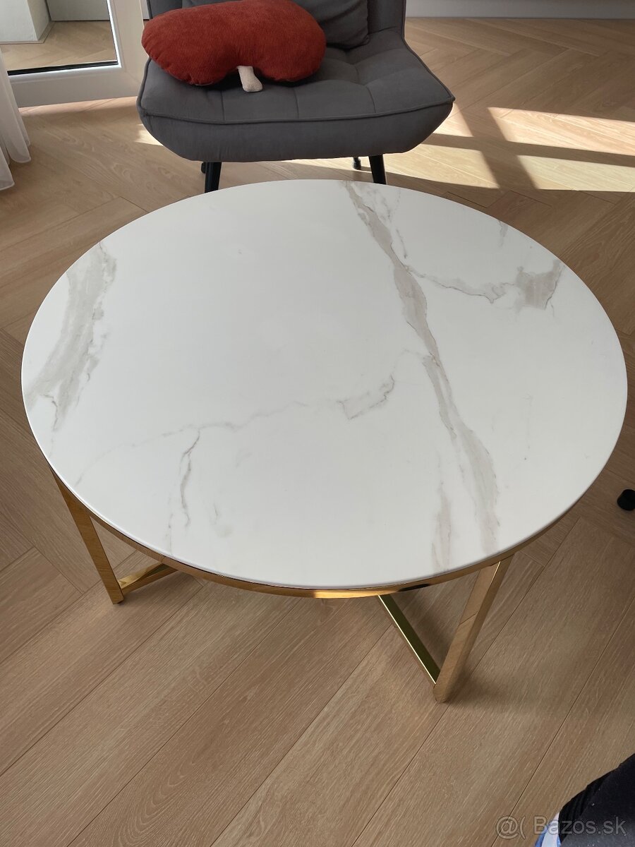 Ponúkam na predaj okrúhly konferenčný stolík so zlatými nožičkami a mramorovým vzhľadom. Je používaný. Konferenčný stolík bielo zlata kombinácia. Rozmery: výška 45cm a priemer je 80cm. Pre viac foto ma kontaktujte