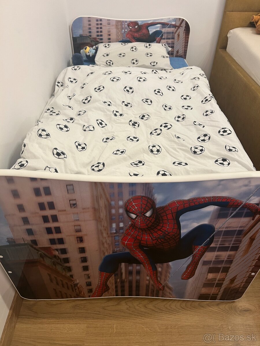Predam minimálne používanú detskú posteľ Spiderman bez známok používania, veľkosť 140x70, spolu s matracom + 2 bočnice ktoré sa dajú dať na hociktorú stranu postele. K posteli darujem 2 napínacie plachty