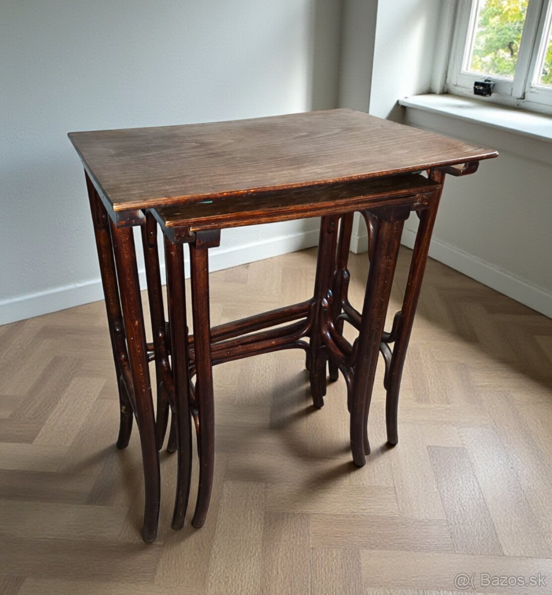 Predám retro set 3 hniezdových stolíkov. Pôvodný set obsahoval 4 stolíky, v tomto sete 1 chýba. Stolčeky sú určené na renováciu. Cena 100€ za celý set.