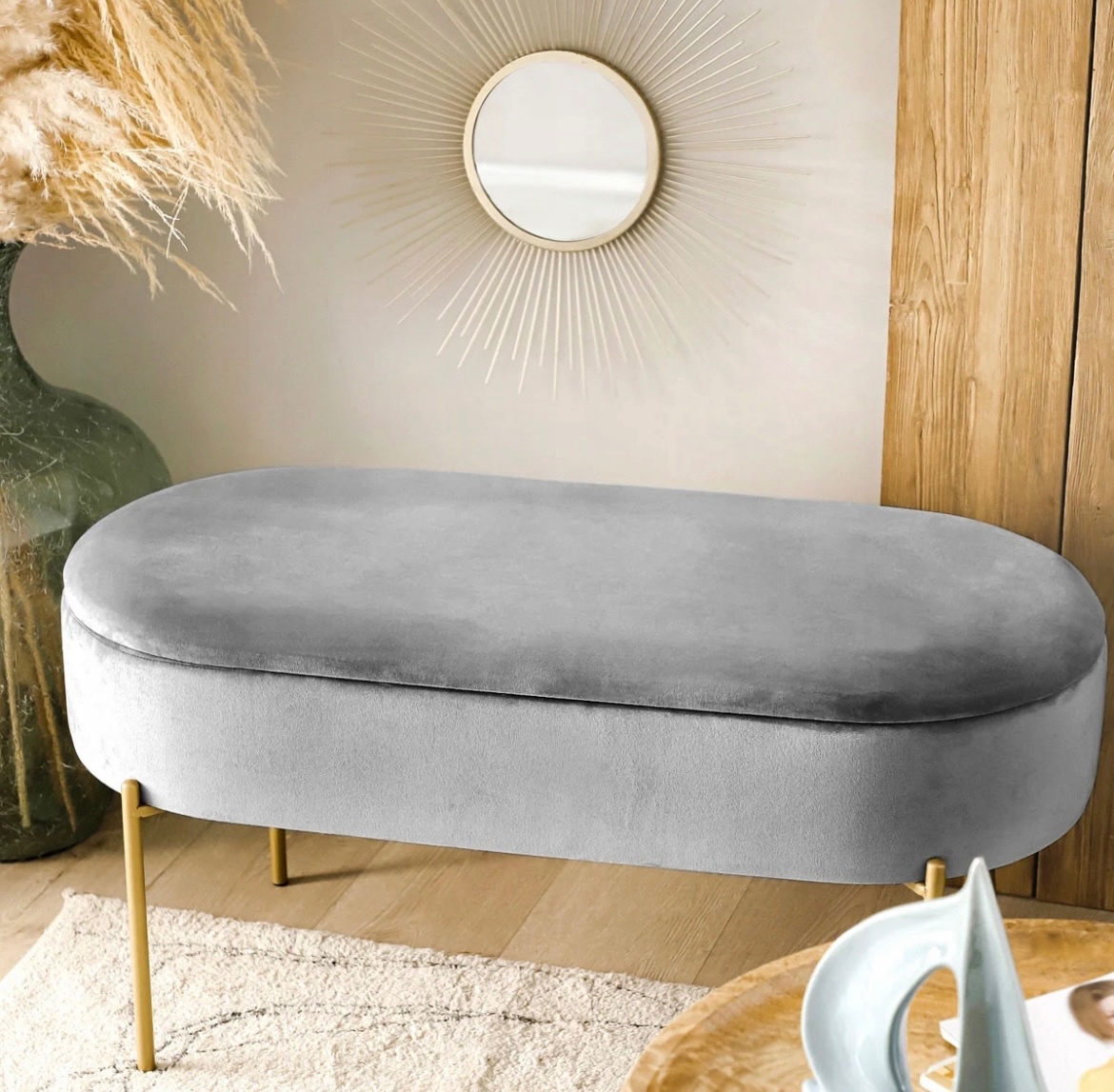 Sivá zamatová lavica do predsiene. Taburet na chodbu. Taburetka s úložným priestorom. Otváracia. Zlaté kovové nožičky. Nová.