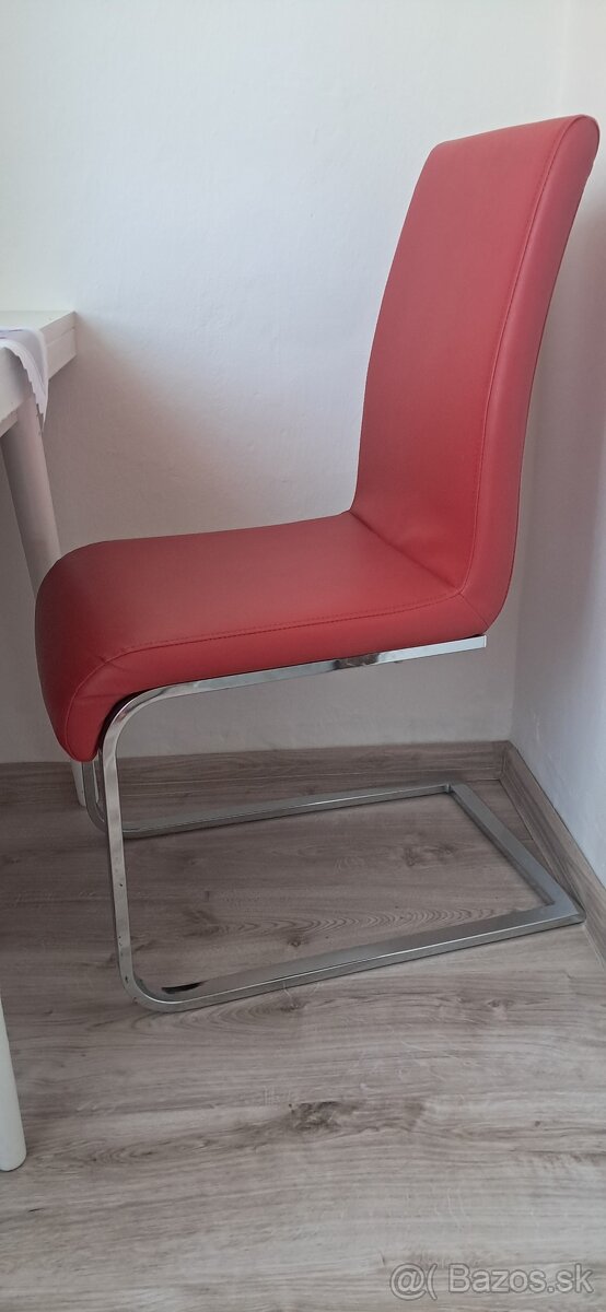 Predám 2 jedálenské, koženkové červené stoličky s chrómovými nohami. Sú použité, ale vo veľmi dobrom stave. Cena za obidve spolu 19 eur.