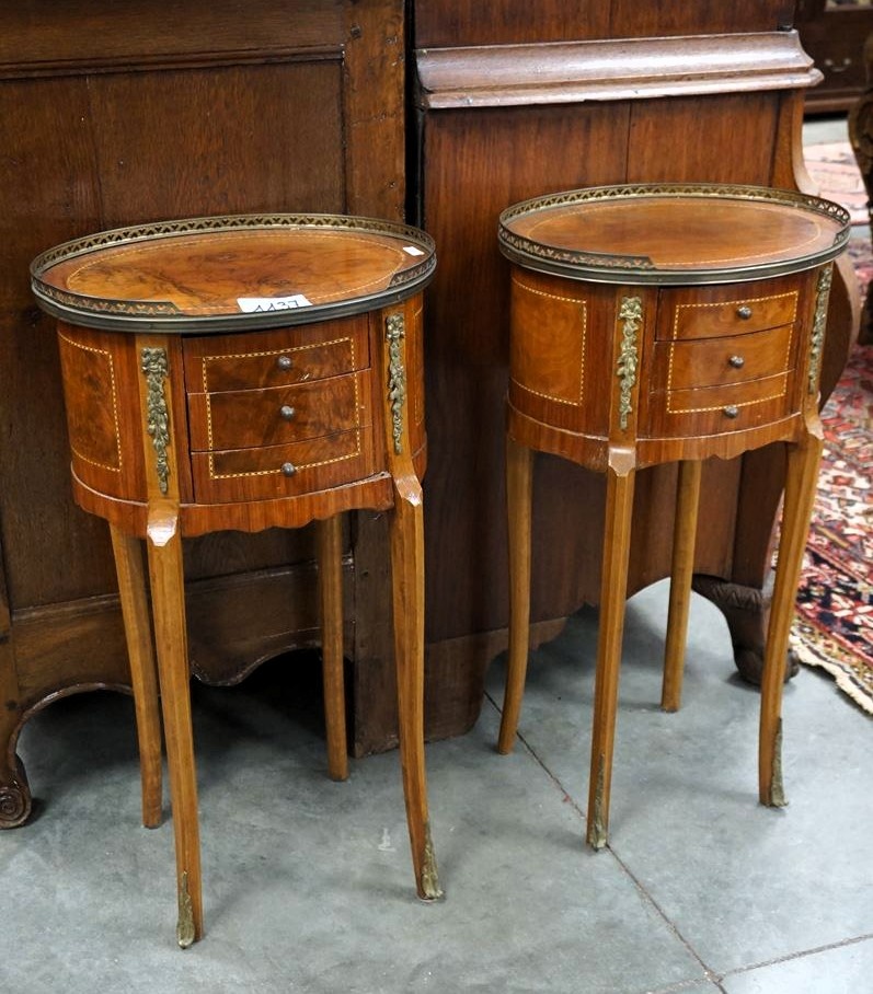 Dve krásne starožitné oválne bočné skrinky, stolíky v intarzii - každá s 3 zásuvkami - v: 74 cm