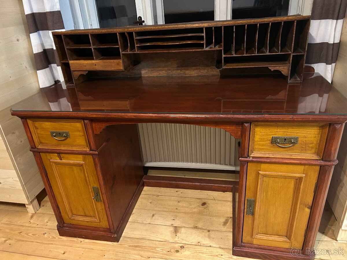 Predám starožitny kancelársky,pracovný stôl s organizérom ,stôl je zreštaurovaný ,sklo na vrchu robené na mieru zabrusene hrany ,organizéru sa treba trocha povenovať ,ten som nereštauroval nepoužíval som ho.Stôl je masív zámky funkčne.