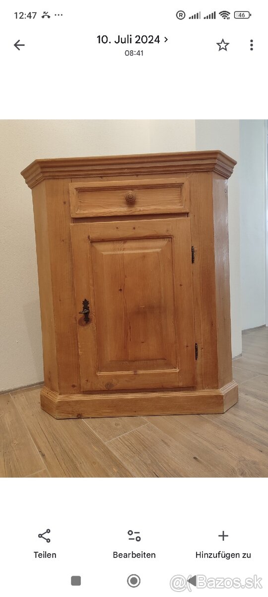Velka rohova skrinka na povesenie. - [27.12. 2025]Z masivneho kvalitneho tvrdeho dreva.Vo velmi dobrom stave.Vyska76cm sirka70cm.