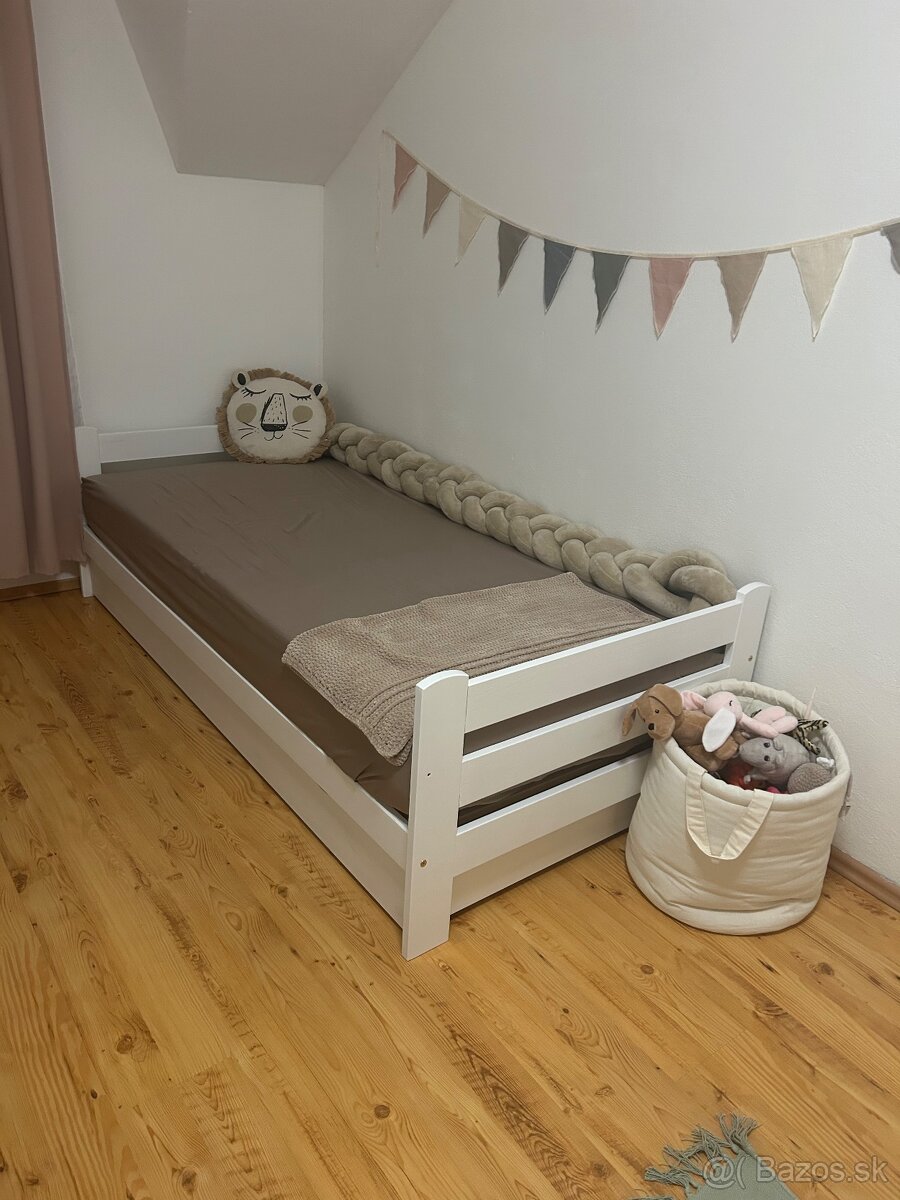 Nová len poskladaná posteľ, 200x90cm, borovicové drevo, odnímateľná bariéra, zásuvka, látkový rošt v cene, odber Malacky