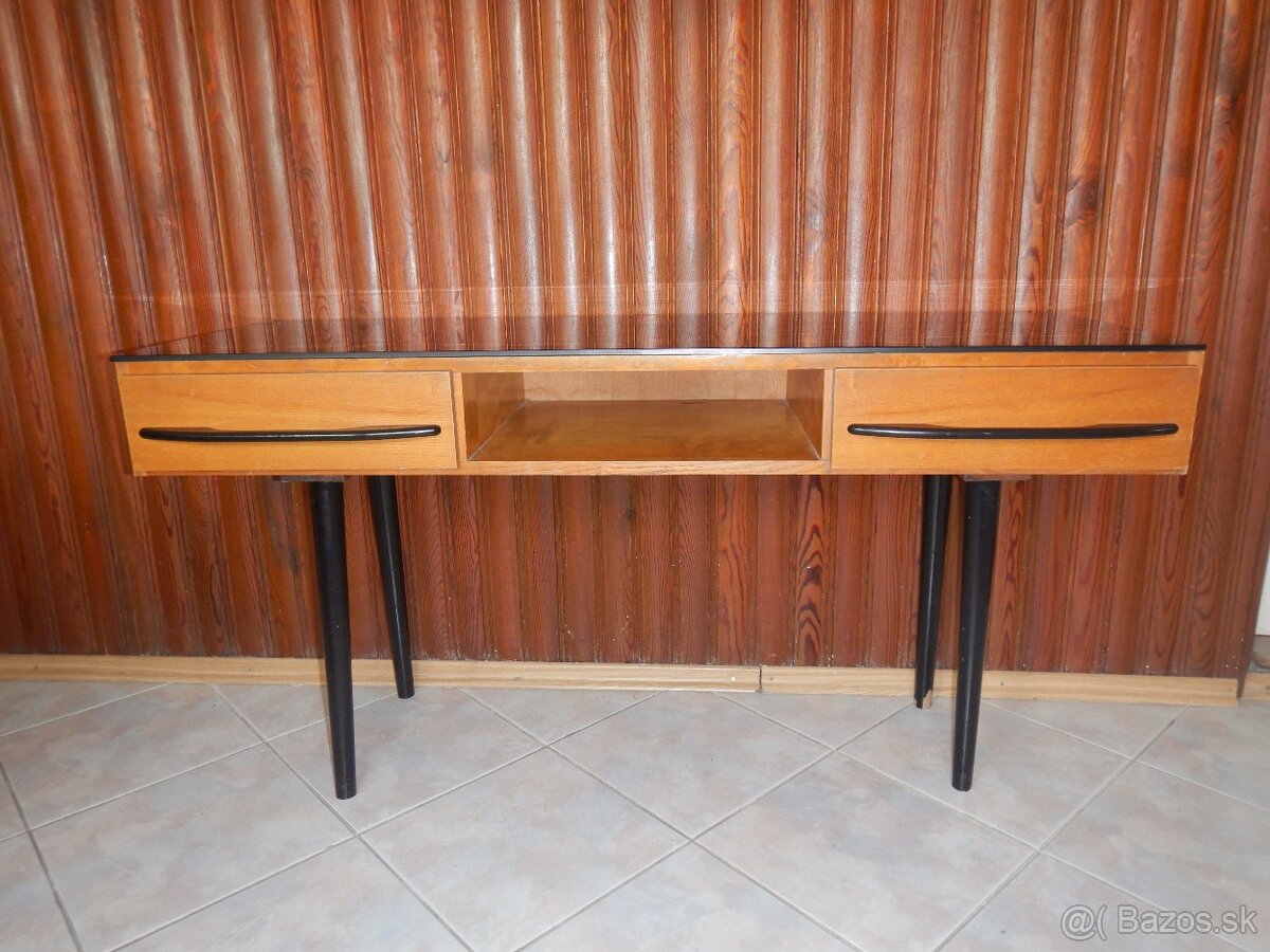 Predám toaletný stolík zo 60 tych rokov navrhnutý špičkovým českým designerom Mojmirom Požárom. Vyrábal sa v UP závodoch. Stolík je v pôvodnom stave, celodrevený s čiernym sklom. V jednom rohu je sklo prasknuté. Rozmery: výška 62cm, dĺžka 120cm, hĺbka 44cm. Pre milovníkov retro, vintage, super ponuka. Možnosť prevzatia v Bratislave.