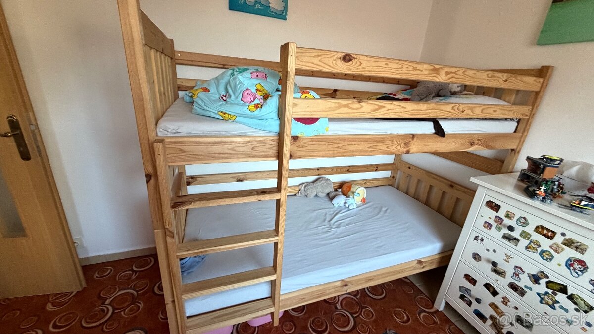 Predám poschodovú postel v dobrom stave, mierne poškodenia…možnosť rozložiť na 2 samostatne postele, bez matracov, rozmer lôžka 90x200cm…rozmer 100x210cm…schody je možné pripevniť na ktorúkoľvek stranu…