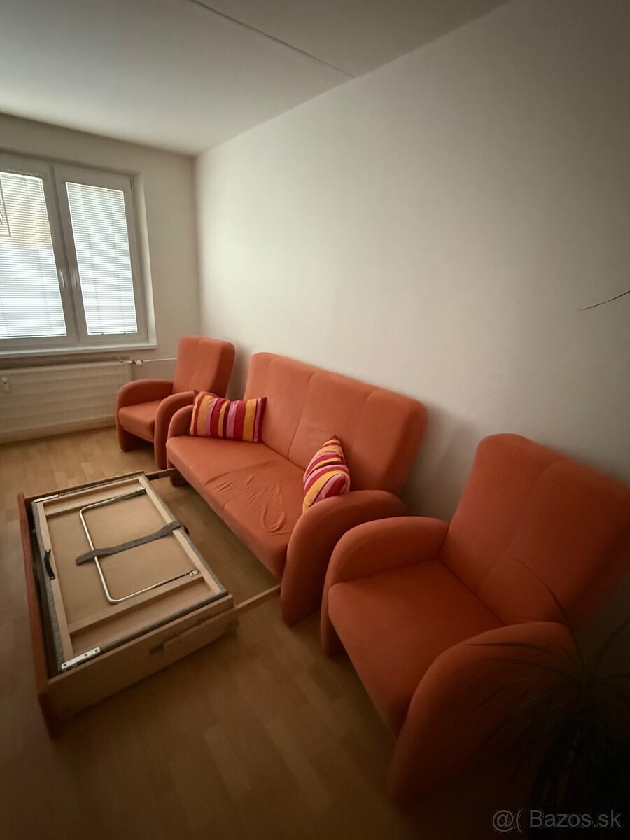 Predám používaný rozťahovaci gauč s dvomi kreslami. Kreslá Š64/V40/H56, Gauč Š162/V40/H60, gauč keď sa roztiahne dĺžka na spanie 195 Š135. Sedačka je v zachovanom stave má známky používania, ale žiadne veľké poškodenia na nej nie sú. Kreslá sa demontovať nedajú ale sedačka áno dajú sa odmontovať bočné opierky a rozkladacia čas. Pre sedačku si treba prísť a odviesť.