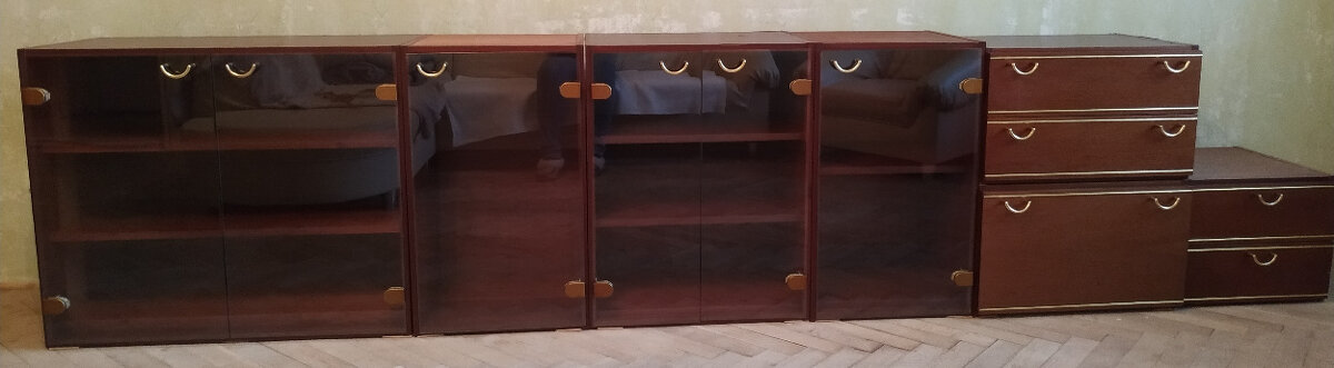 Predám vitríny a komodu zo starej obývačkovej zostavy v mahagónovej farbe. Vyžaduje renováciu vrchnej časti.