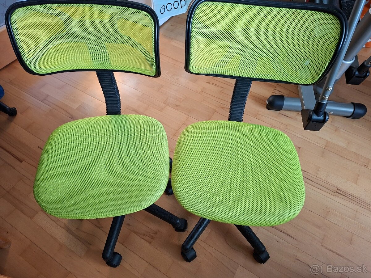 Výškovo nastaviteľné 2 stoličky pre deti. Čalúnený sedák a oporná časť potiahnuté limetkovou sieťovinou.