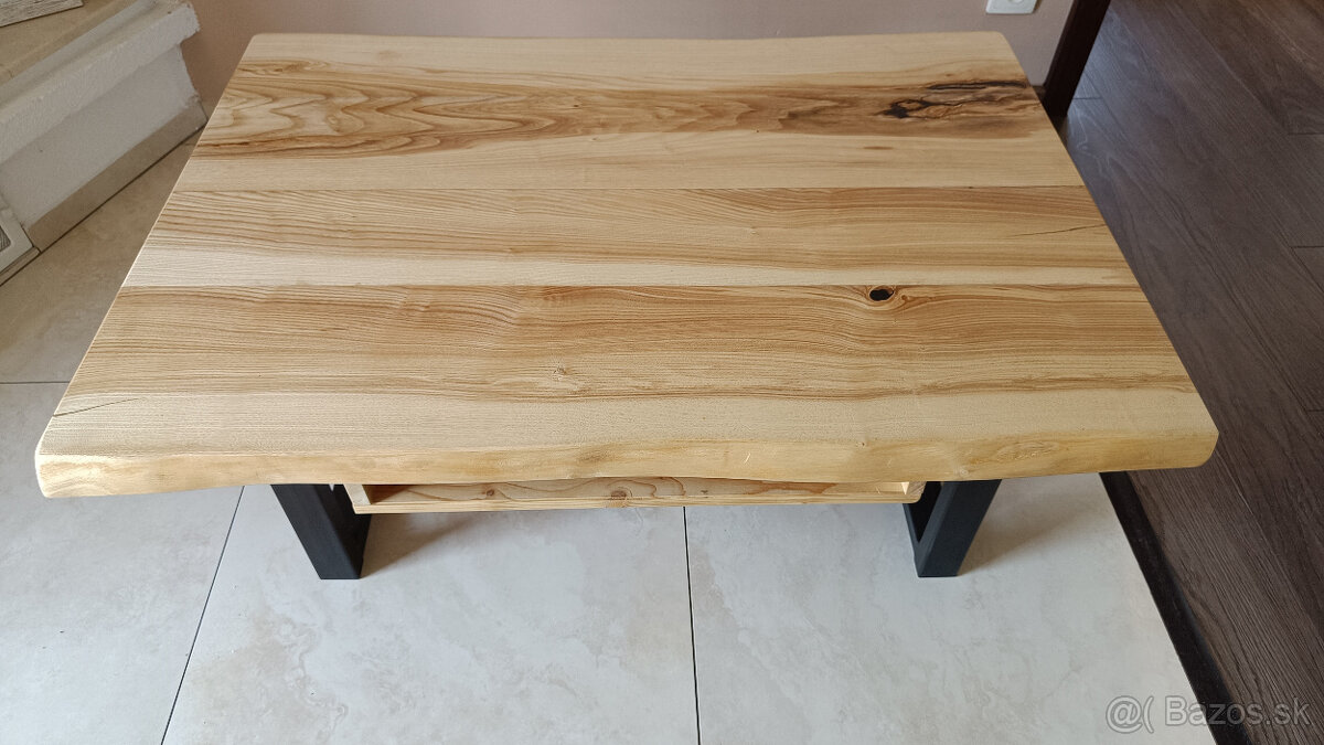 Svetlý stolík je natretý lakom Osmo a má tiež praktický odkladací priestor.Praskliny sú vyplnené epoxidovou živicou.Všetky hrany sú jemne zabrúsené.