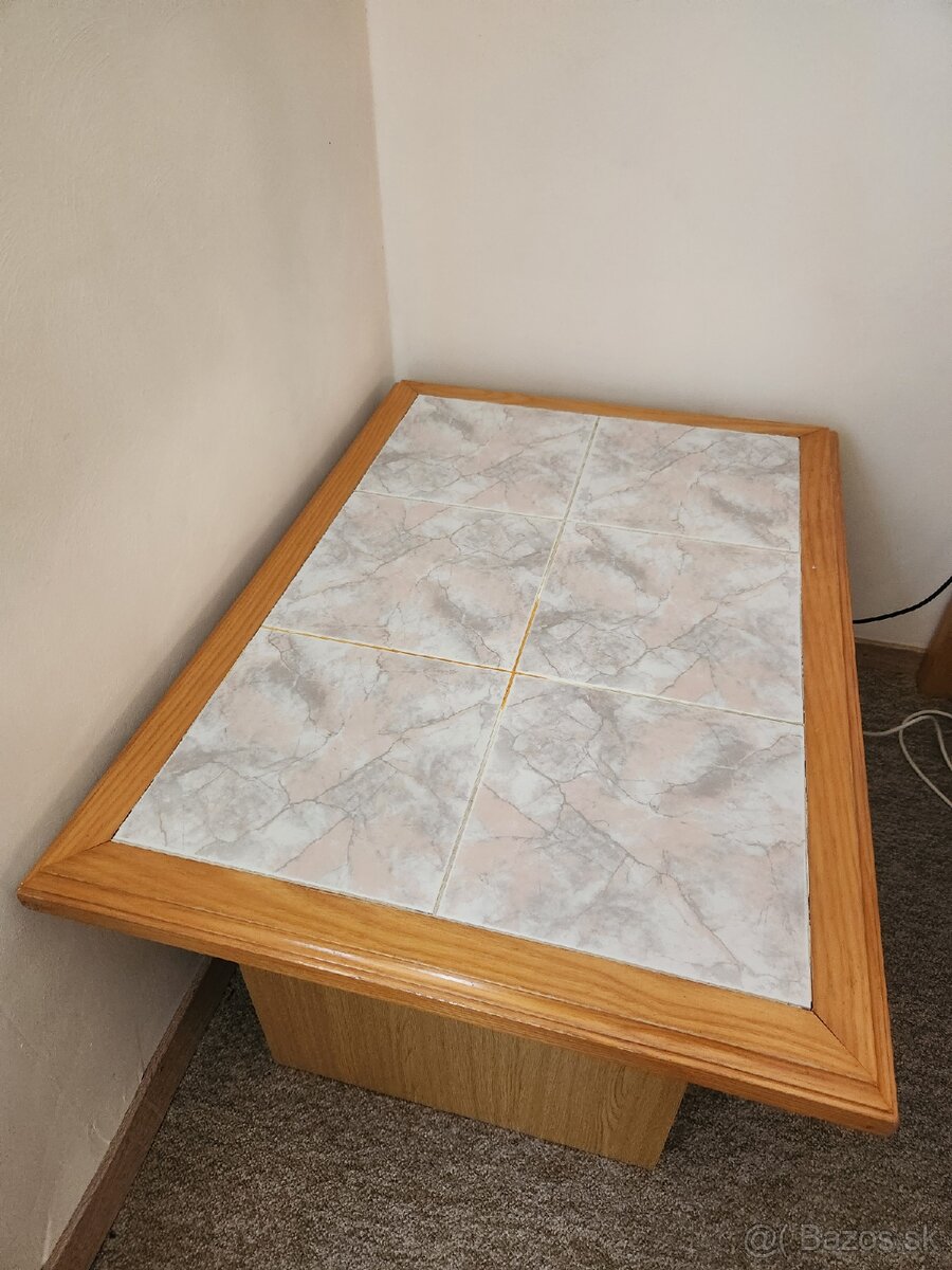 Predám konferenčný stolík - horná doska je masívny drevený rám vyplnený dlažbou o rozmere 73x103cm - dolná časť je drevotrieska s policou. Výška stolíka je 53cm. Cena 20€