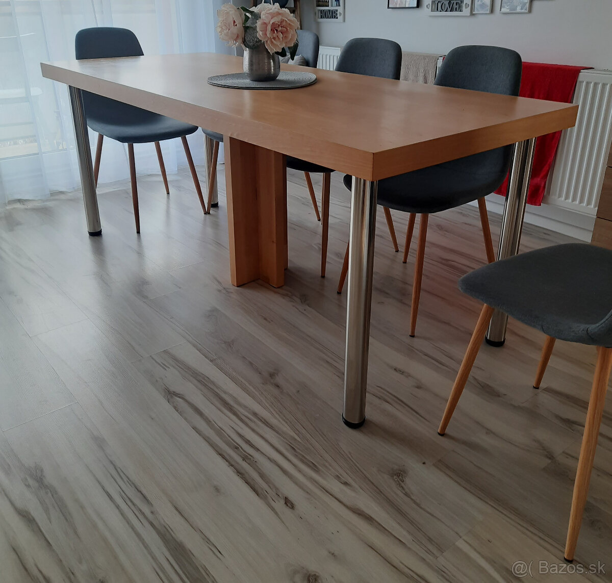 Predám rok starý, na mieru vyrobený veľký jedálenský stôl pre 8 ľudí široký 82, dlhý 193,5 a vysoký 77,5cm s hrúbkou dosky 6cm. Chrómové nohy sú výškovo nastaviteľné a väčšiu stabilitu zabezpečuje stredová krížová moja. NR.