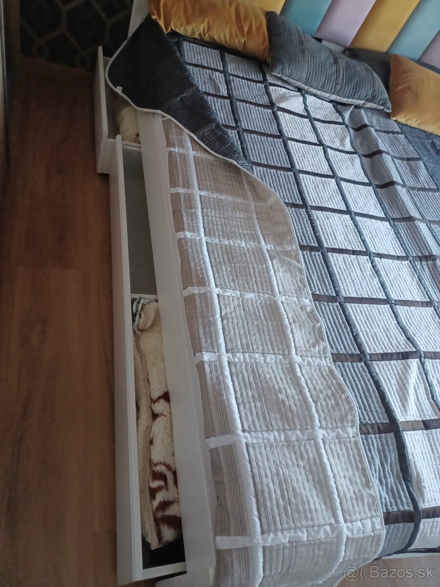 Manželská posteľ 200x165. Na jednej strane sú pod posteľou 3 úložné priestory. Predáva sa s matracom plus pamäťový matrac. Dôvod predaja-nepotrebna posteľ. Je v dobrom stave. Zatiaľ je zložená.