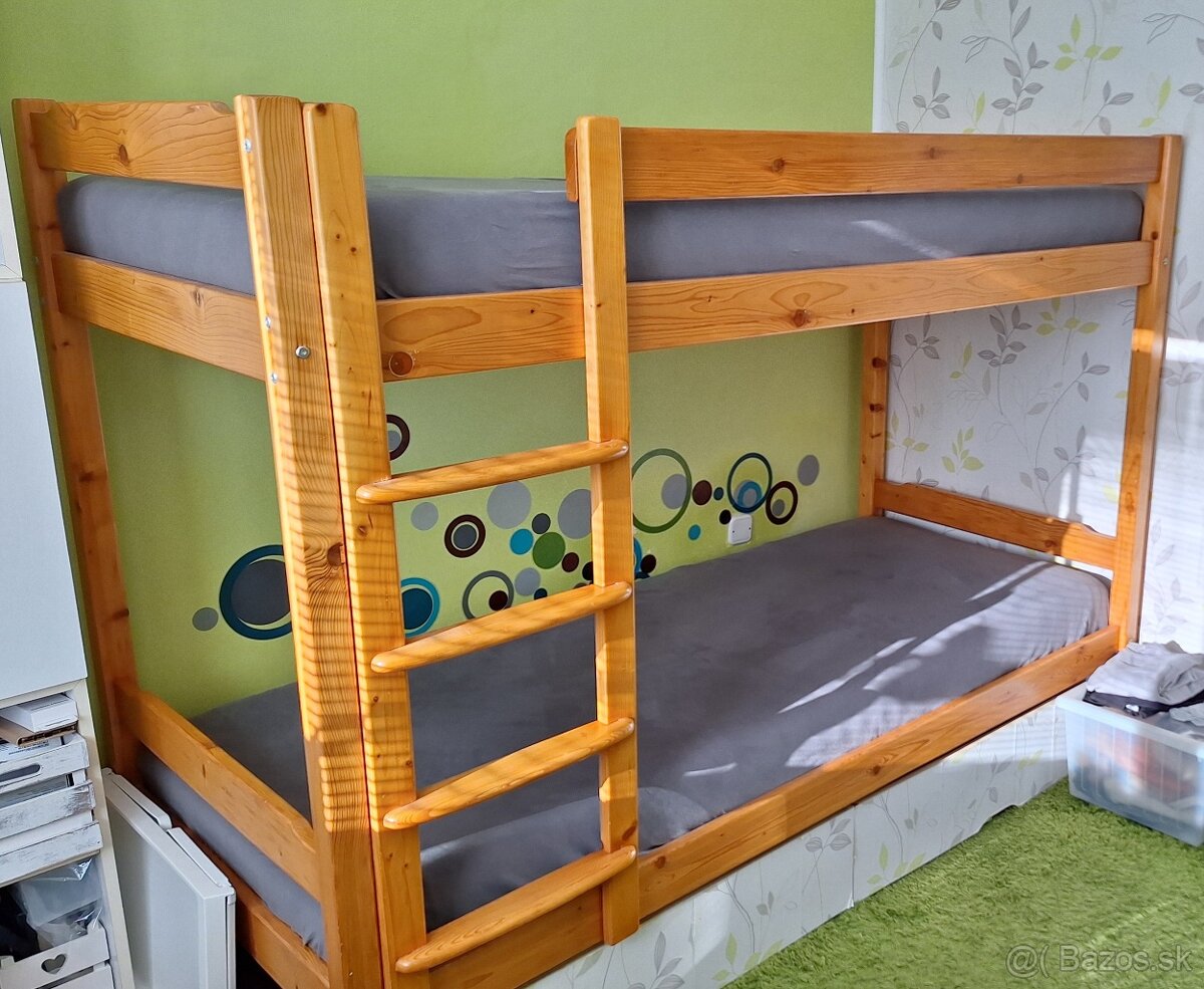 Predám zachovalú poschodovú posteľ z masívu rozmer : výška 152 cm , dĺžka 206 cm , šírka 92 cm, pre štandardný matrac 200 x 80 cm v dobrom stave , bez matracov , 2 ks šuflíky zdarma