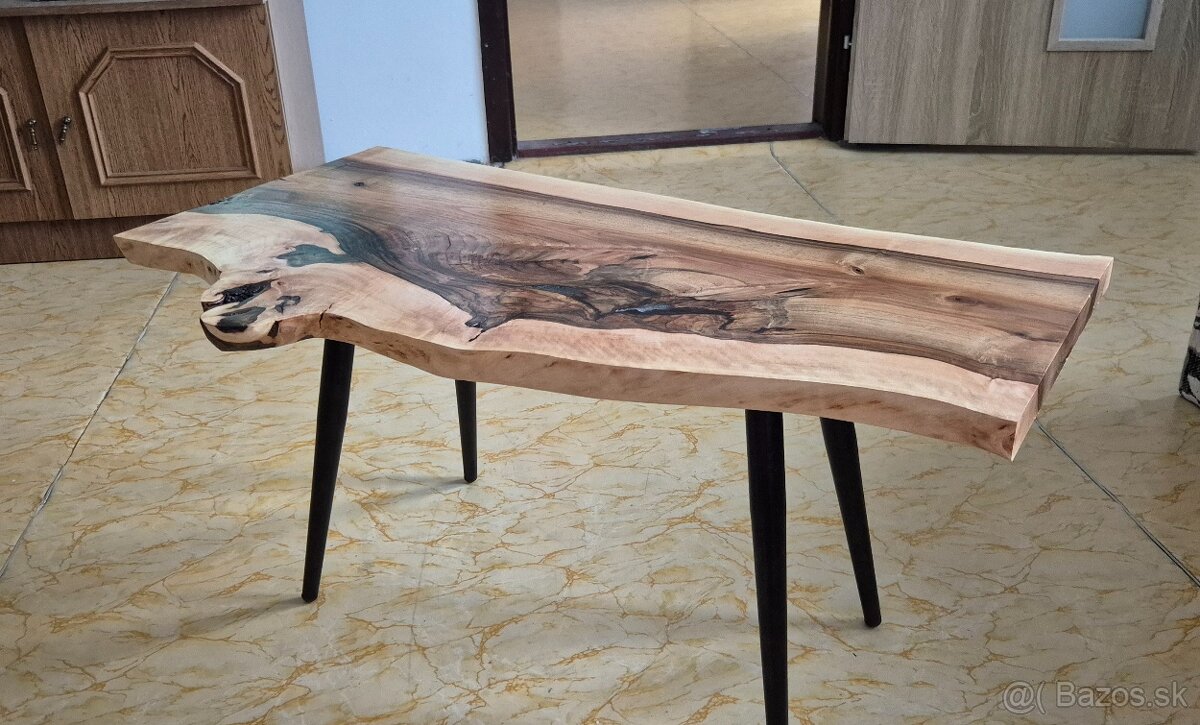Svetlý stolík je natretý lakom Osmo a má tiež praktický odkladací priestor.Praskliny sú vyplnené epoxidovou živicou.Všetky hrany sú jemne zabrúsené.
