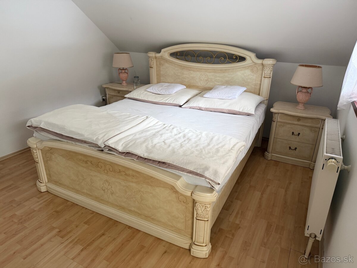 Na predaj krásna rustikálna posteľ v top stave spolu s dvoma nočnými stolíkmi a komodou, matrac je súčasťou (obsahuje ovčie rúno len si ho treba vytepovať)