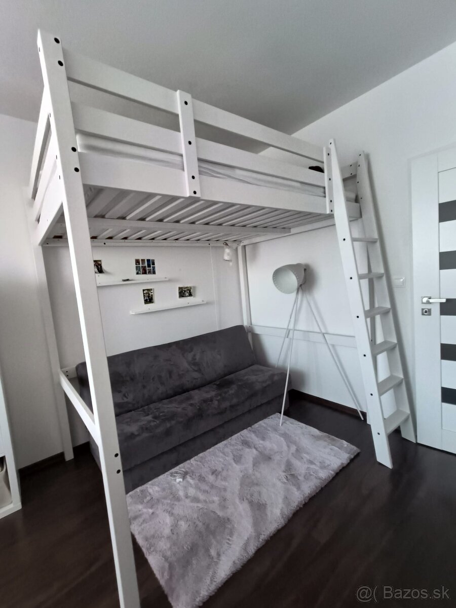 Poschodová posteľ - [26.12. 2025]Predám poschodovú posteľ s matracom, biela, pôdorys 212,5 x 152cm, výška so zábradlím 199cm, výška od podlahy po vrch matraca 183cm. Rozmer matraca 200x140cm. Cena 430€