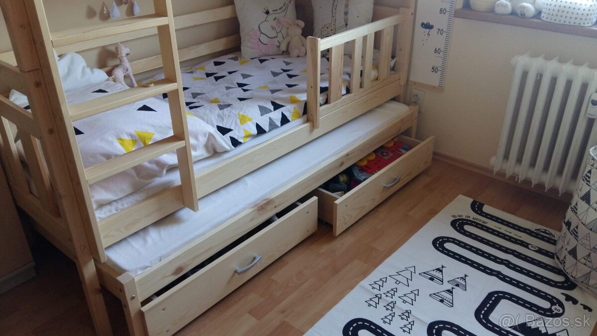 Bez matracov. S úložnými zásuvkami a výsuvným tretím lôžkom. Odnímateľné spodné zábradlie je poškodené.