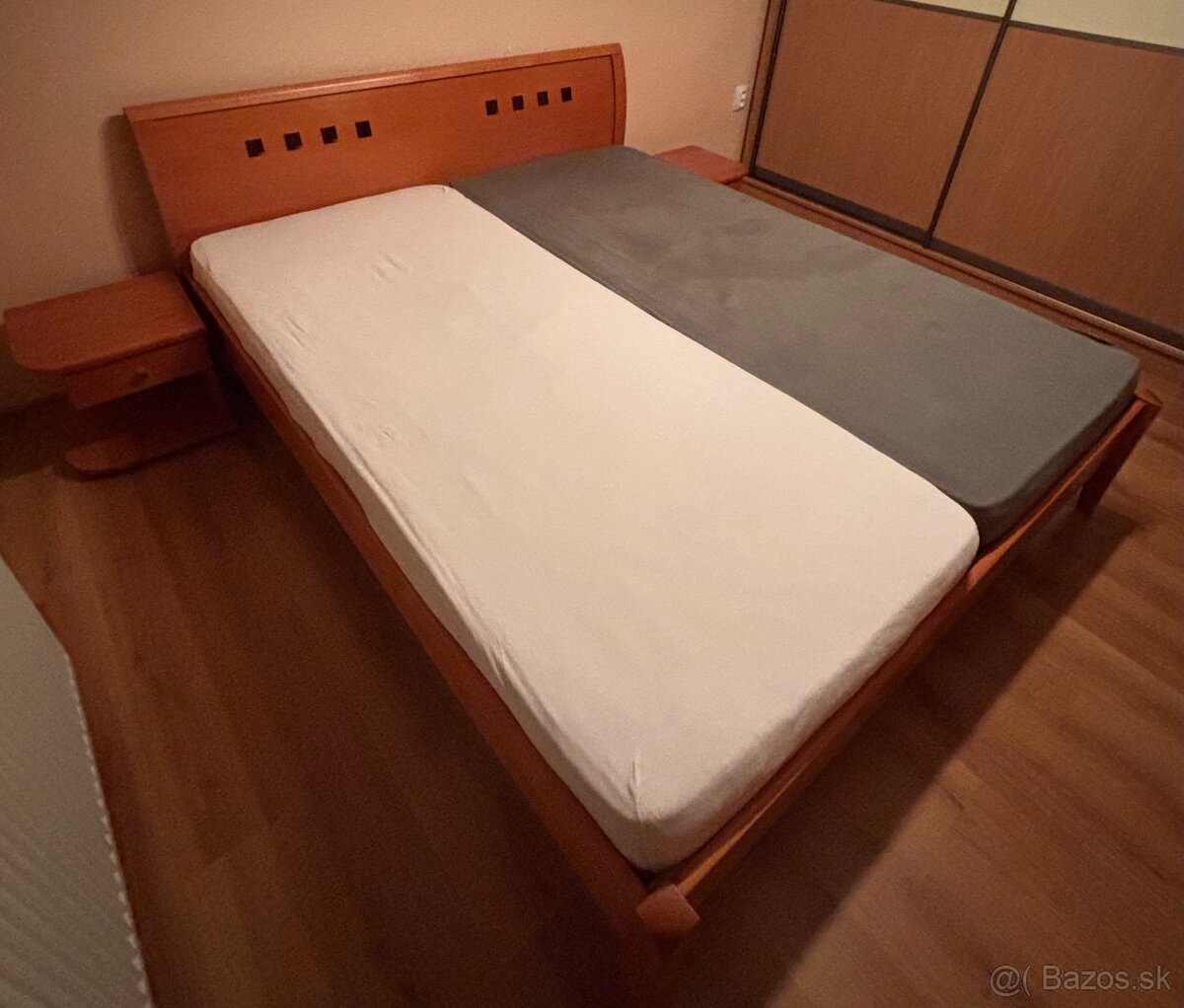 Ponúkam na predaj kvalitnú, pevnú manželskú posteľ vo veľmi dobrom stave, ako na foto. Výroba na zakázku, predĺžená o 10cm. Materiál masív buk parený. Rozmery: ložná plocha 180x210, posteľ 187x226, výška čela 90, nočné stolíky: 45x41x41, matrace 90x210 sú v cene.