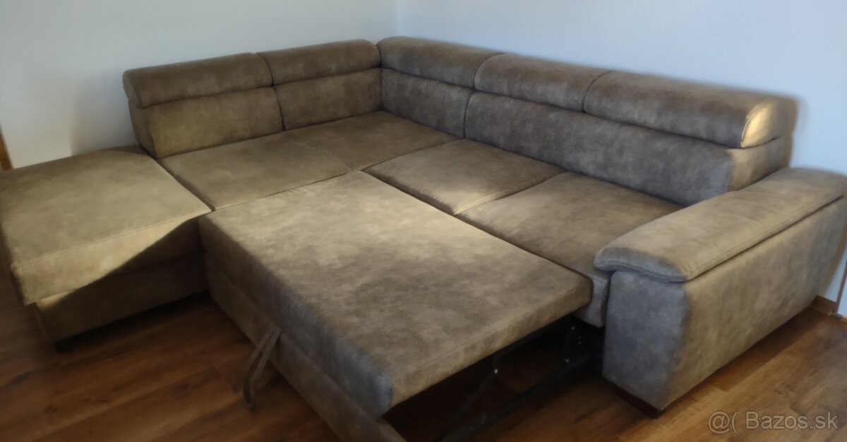 Predám rozkladaciu rohovú sedaciu súpravu v tvare L s úložným priestorom. Sedacia súprava má polohovateľné opierky hlavy.