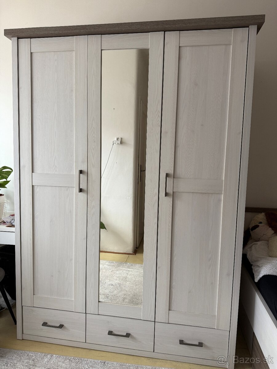 Predám šatníkovú skriňu v bielom píniovom decore. Kupovaná v 2023 za cca 420-450 eur.