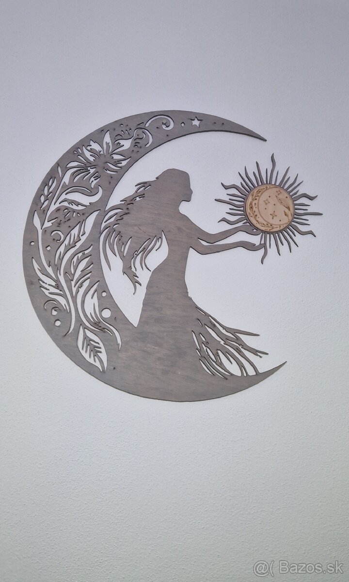 Moderná nástenná dekorácia ktorá zaujme detailným vyrezávaním a originálnym motívom ženskej siluety prepojenej so slnkom.