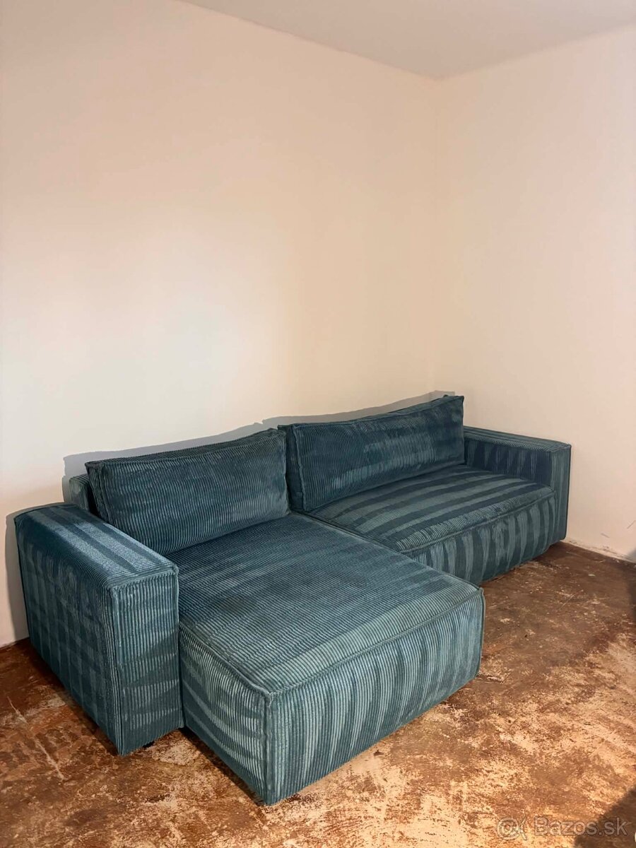 Predám zachovalú rohovú, rozkladaciu sedaciu súpravu, krásna tyrkysová farba s menčestrovým poťahom. Tie vzory na fotkách sú spôsobené tepovaním, používaním zmiznú. Gauč je čerstvo vytepovaný (29.12) a počas fotenia ešte nie úplne suchý, preto tie pruhy.