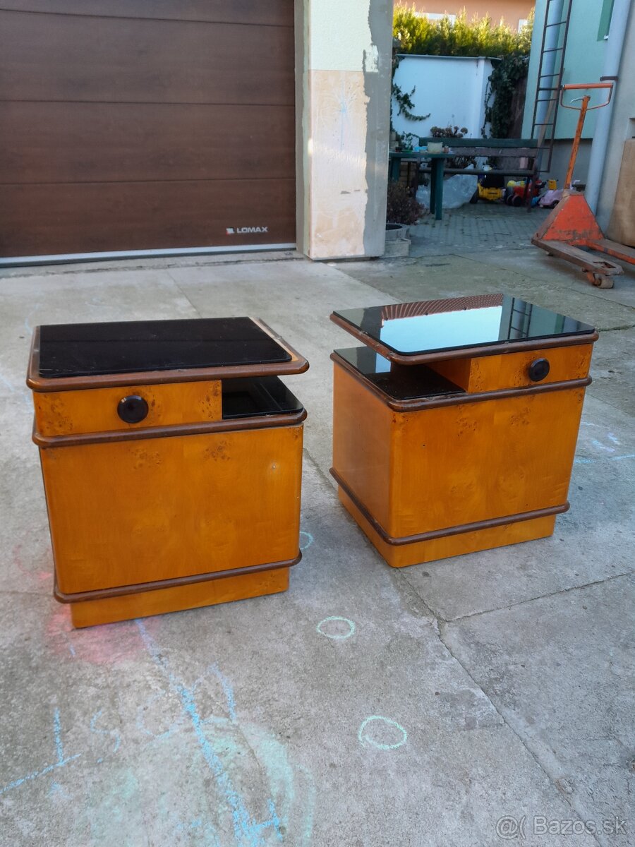 retro nábytok, skrinka nočný stolík, drevená skriňa, na jednom stolíku je horné sklo menšie ako má byť. Iba osobný odber