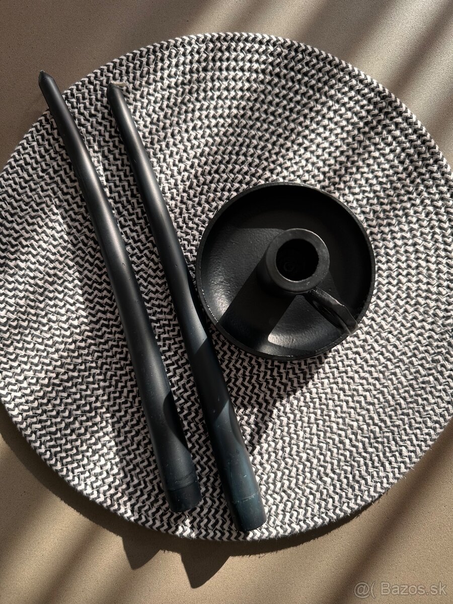 Predam retro svietnik a 2 sviecky ciernej farby. Vzhladom na velkost a krehkost sviecok, idealne osobny odber. Priemer cca 11,5cm a vyska cca 7cm.