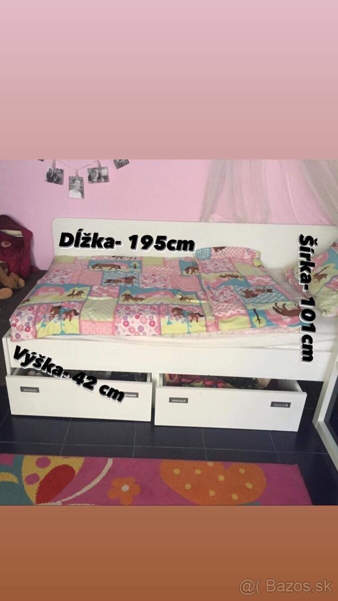 Posteľ 90x200 cm + nový matrac - [31.12. 2025]Predám jednolôžkovú posteľ v rozmeroch 90x200 cm (š x d). Vhodná do detskej alebo hosťovskej izby. Súčasťou rámu postele sú aj dva vyťahovacie šuplíky použiteľné ako úložný priestor. V cene je zahrnutý aj nový matrac.