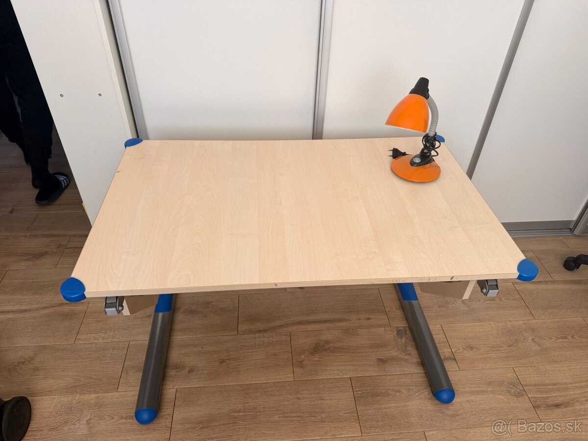 Predam detsky vyskovo nastavitelny pisaci stol spolu s lampou. Rozmery stola 110x65cm, vyska nastavitelna.