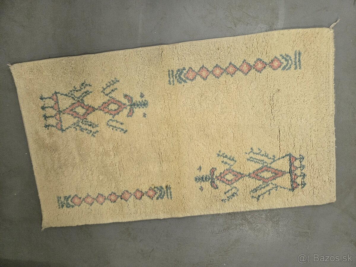Ponúkam na predaj ručne viazaný asi 30 ročný 2 cm hrubý koberec s typickým beduinským motívom. Pôvodná farba biela, treba vyčistiť.