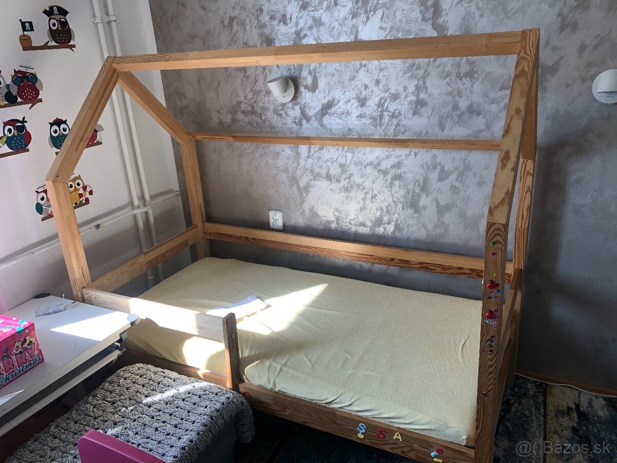 Predám detskú domčekovú posteľ s rozmermi 80x160x148,5 (š,d,v) vrátane matraca 80x160. K posteli je aj zábrana, nožičky sú vo výške 20cm. Domčeková posteľ je z borovicového masívu bez chemickej úpravy s hladným opracovaním. Posteľ aj matrac sú vo veľmi dobrom stave. Posteľ je v rozloženom stave a spojovací materiál k posteli odovzdám v krabici. Osobný odber v Bratislave (Rača) resp. možnosť dovozu v Bratislave a okolí. Cena domčekovej postele vrátane matraca je 130 EUR. Cena je konečná.