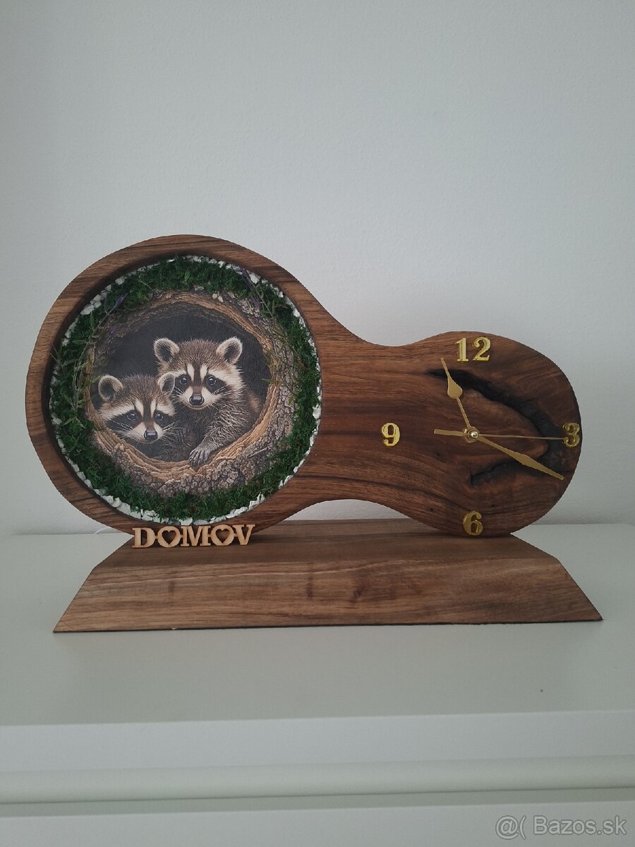 Ručne robené hodiny z masívneho orechového dreva, dĺžka 46 cm, výška 30 cm. Originálny motív s medvedíkmi čistotnými, zvýraznený LED podsvietením s napájaním cez USB (5 V). Elegantný a útulný doplnok do interiéru, ktorý spája prírodu s moderným dizajnom. Cena: 80 €