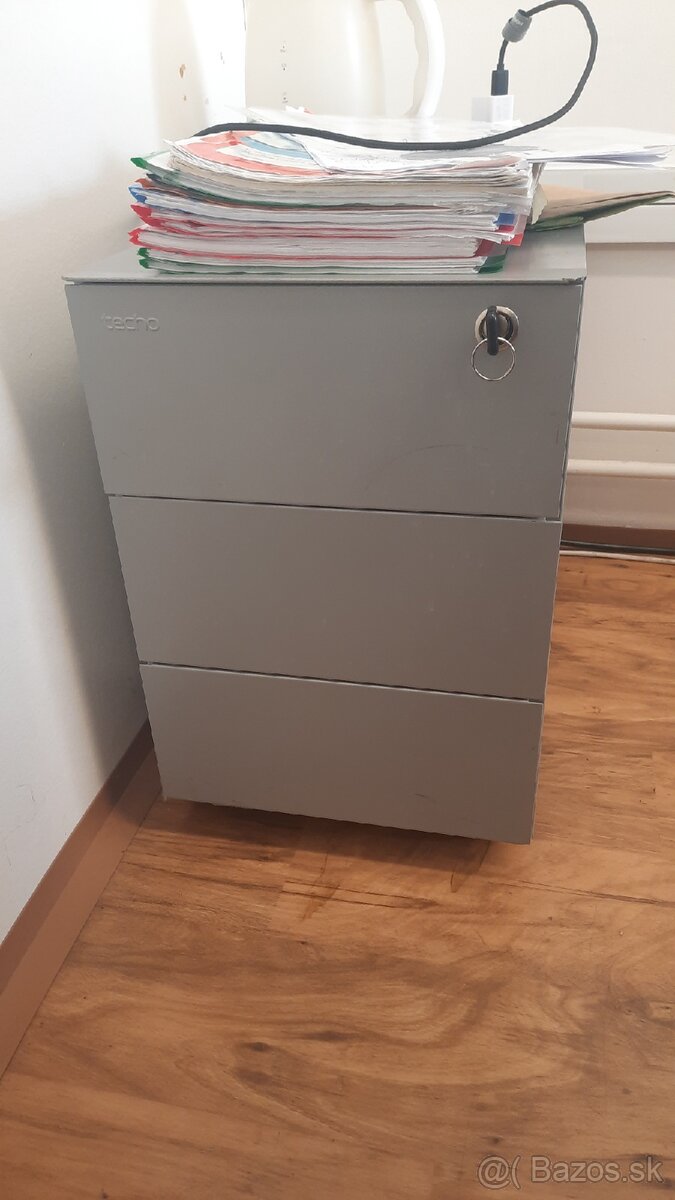 Kovová komoda s tromi zásuvkami a kolieskami. Rozmery: 33x59cm, výška 51cm. K dispozícii sú dva kusy, jeden so zámkom.