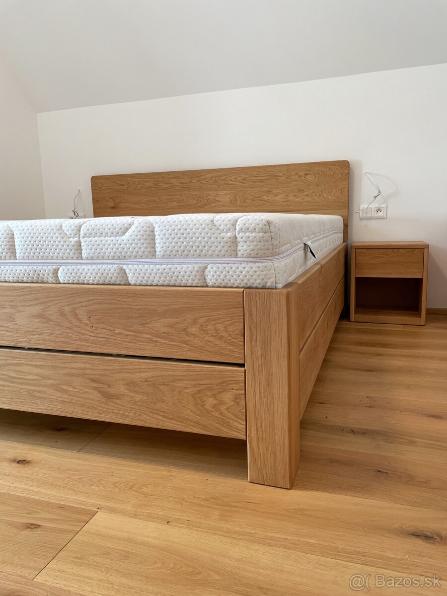Masívna dubová posteľ s výklopnými roštami a praktickým úložným priestorom. Vyvýšené dno umožňuje jednoduchú údržbu podlahy pod posteľou - ideálne aj pre robotický vysávač. Zaoblené hrany postele, povrch ošetrený kvalitným tvrdým voskovým olejom Osmo. Slovenská výroba, ručná práca, kvalitná pevná a stabilná konštrukcia.