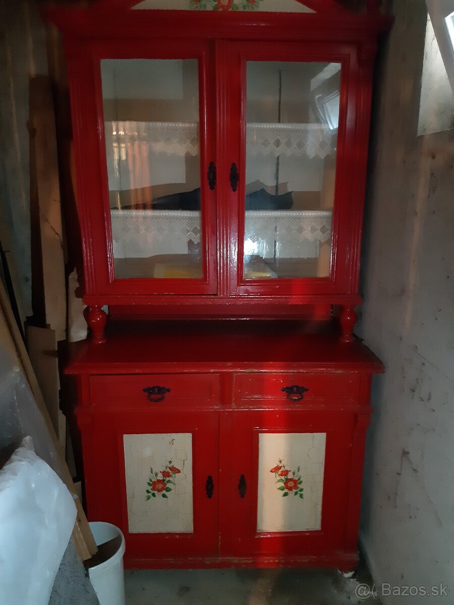 Predám vintage kredenc + komoda + stolička. Farba:červená/biela,maľované dvierka. Zachovalé,suché,nečervavé. Komoda:švh:104/90/45cm. Kredenc:švh:100/210/40-57cm. Cena komplet aj so stoličkou. Stav:vid.foto. Osobný odber:Hainburg an der Donau,Rakúsko-10km od BA hranice. V prípade záujmu volať prosím po 15h.