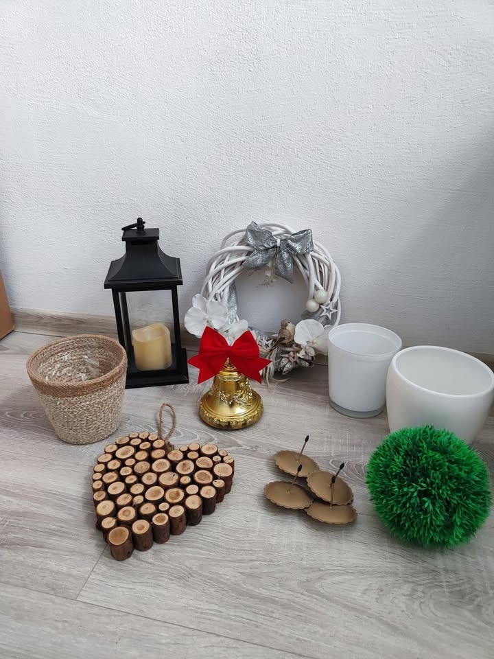 drevené kolieska 3€/ks, srdiečko 8€, miska ježko 4€,kvetináče 2,50€/ks, svietnik zo soli (oranžový) 4€, kvetináč ježko 3€, svietnik čierny 10€, ježko 3€, korýtko 2€, zasnežená gulička s ježkom 1€, zelená guľka 1€, kvety v betónovom kvetináčiku 1,50€/ks, vrecko červené 2€