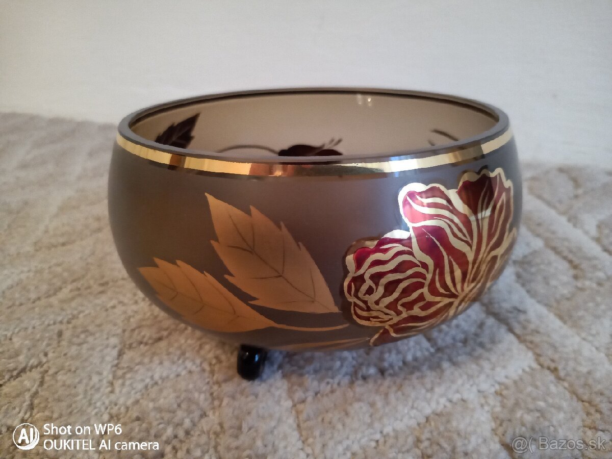 Misa na troch nožičkách z dymového hnedého skla, s motívom kvetov v červenej (až bordovej) farbe v kombinácii so zlatou.