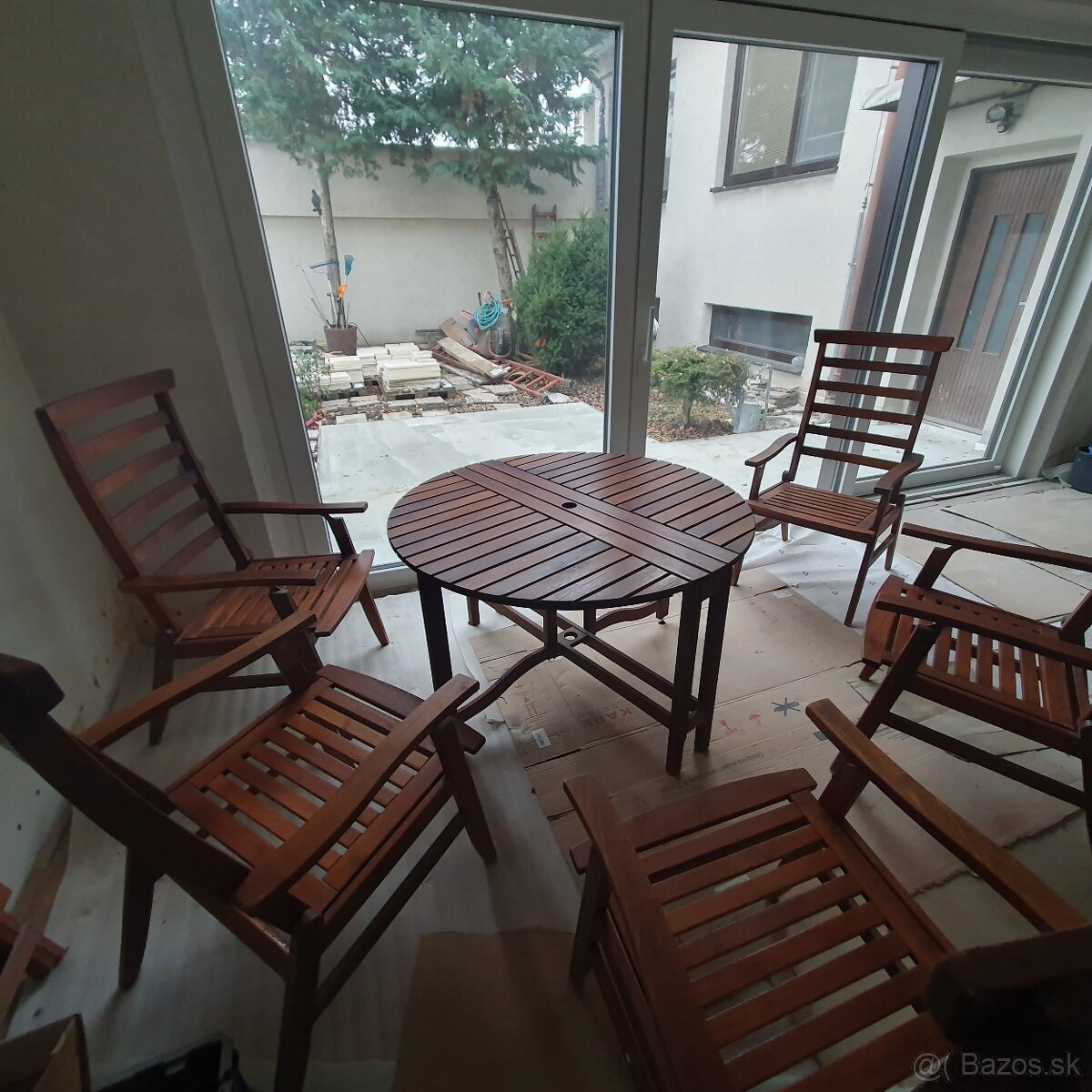 Pevné taek drevo, polohovacie stoličky, stôl sa skladá z oboch strán na cca 30 cm šírku pri skladovaní. Predám ako celok za 195,-€